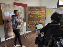 Der Fragenkiosk, ein mobiler Stand der flexibel dort wo er benötigt wird aufgebaut werden kann, wurde entwickelt um Forschungsfragen an eine breitere Masse außerhalb der im Projekt stattfindenden Workshops zu richten. Hierbei erhofft sich das Team, zusätzlich zum Austausch mit Menschen mit Behinderung auch Input von anderen Stakeholder:innen, wie zum Beispiel Mitarbeitenden der Eingliederungshilfe zu erhalten.